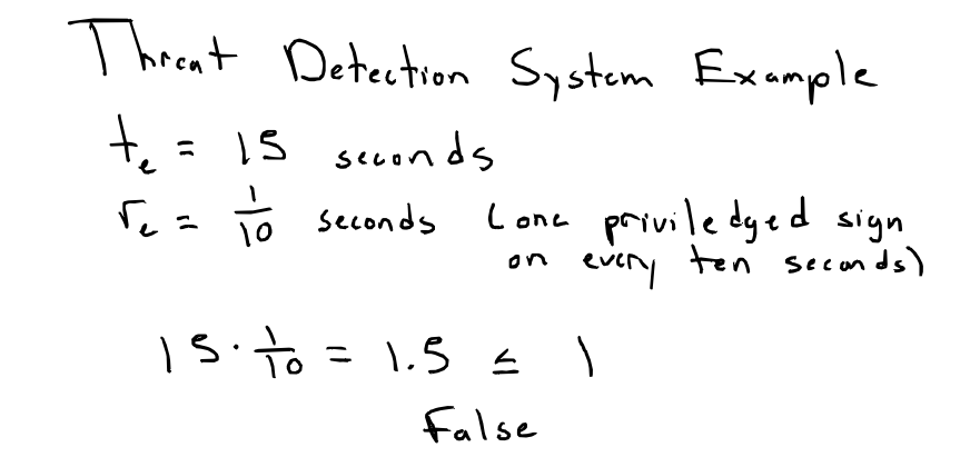 Suppose that you’ve created a threat detection system and, each time a user in the network logs in to a privileged account, it does a certain set of operations. Suppose you can observe via system telemetry that the entirety of the processing that must occur after a single privileged logon requires 15 seconds (1).
